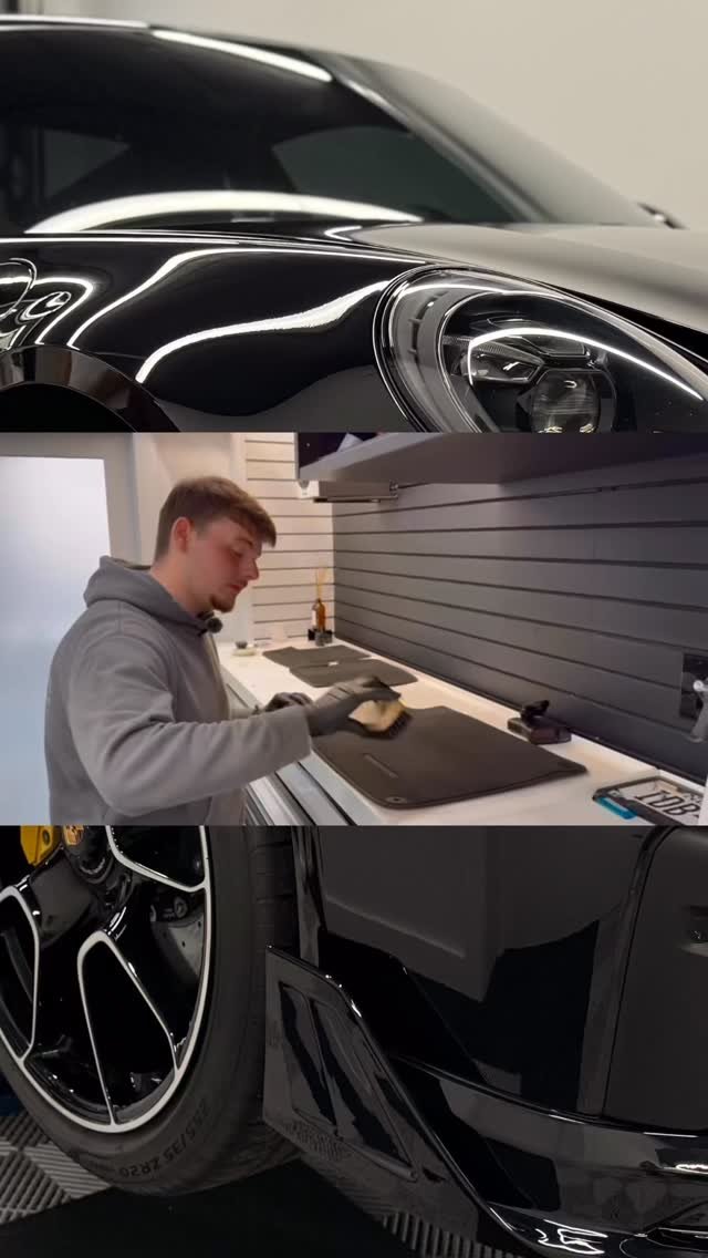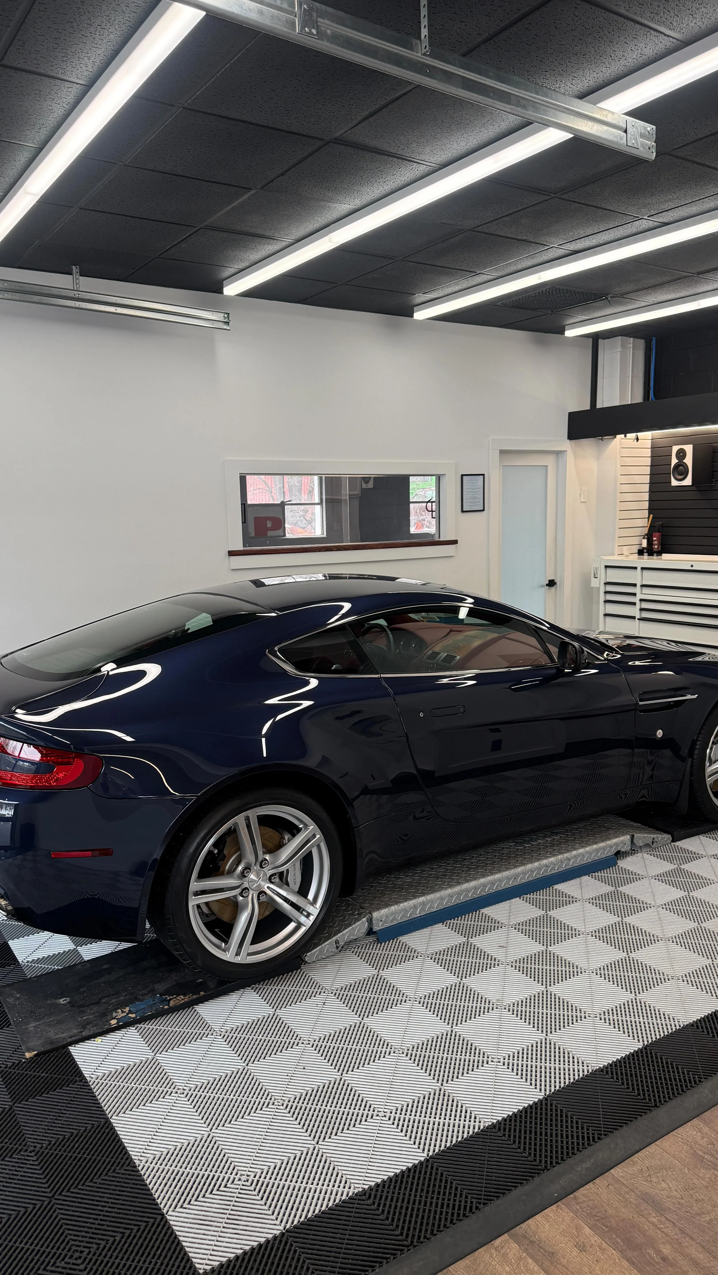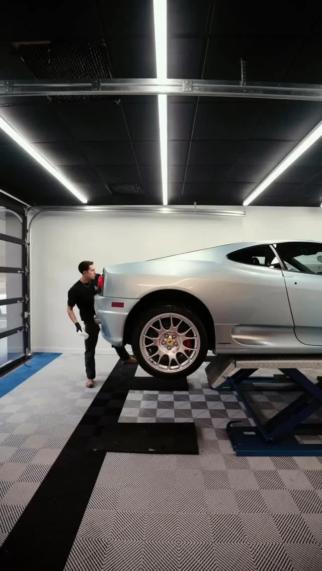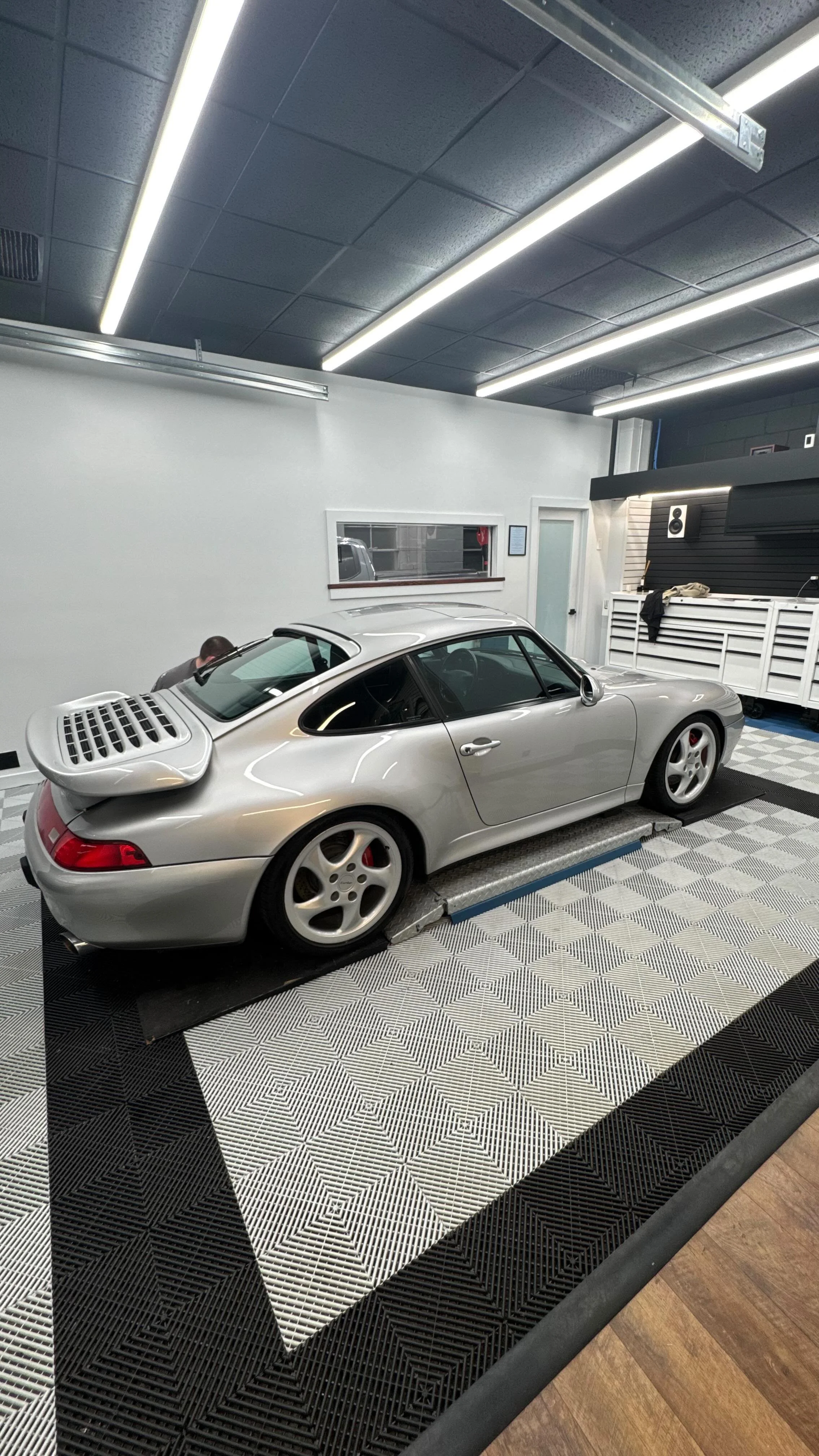 View through a window showing a black Mercedes-Benz G-Class SUV parked inside a garage with a checkered floor.