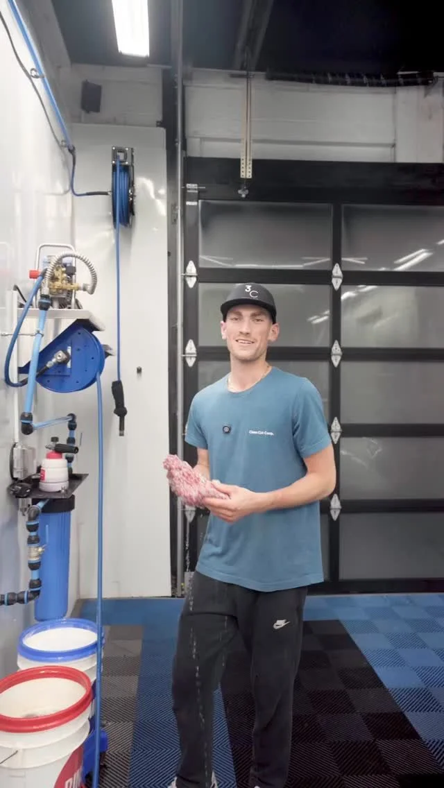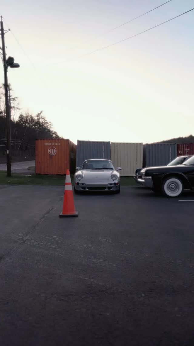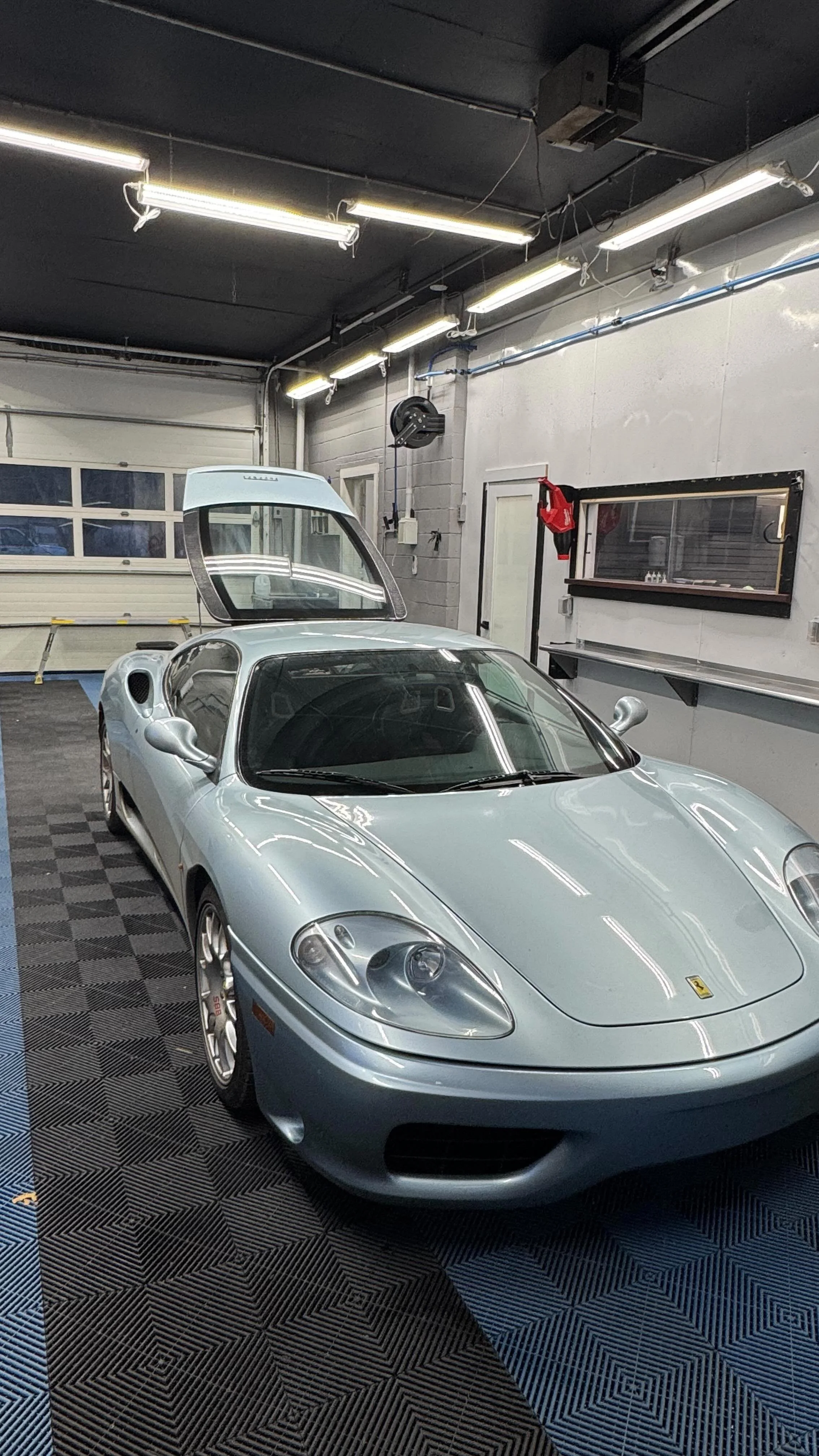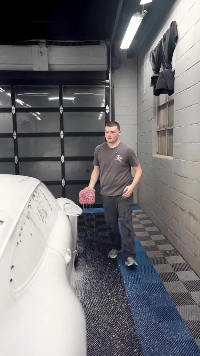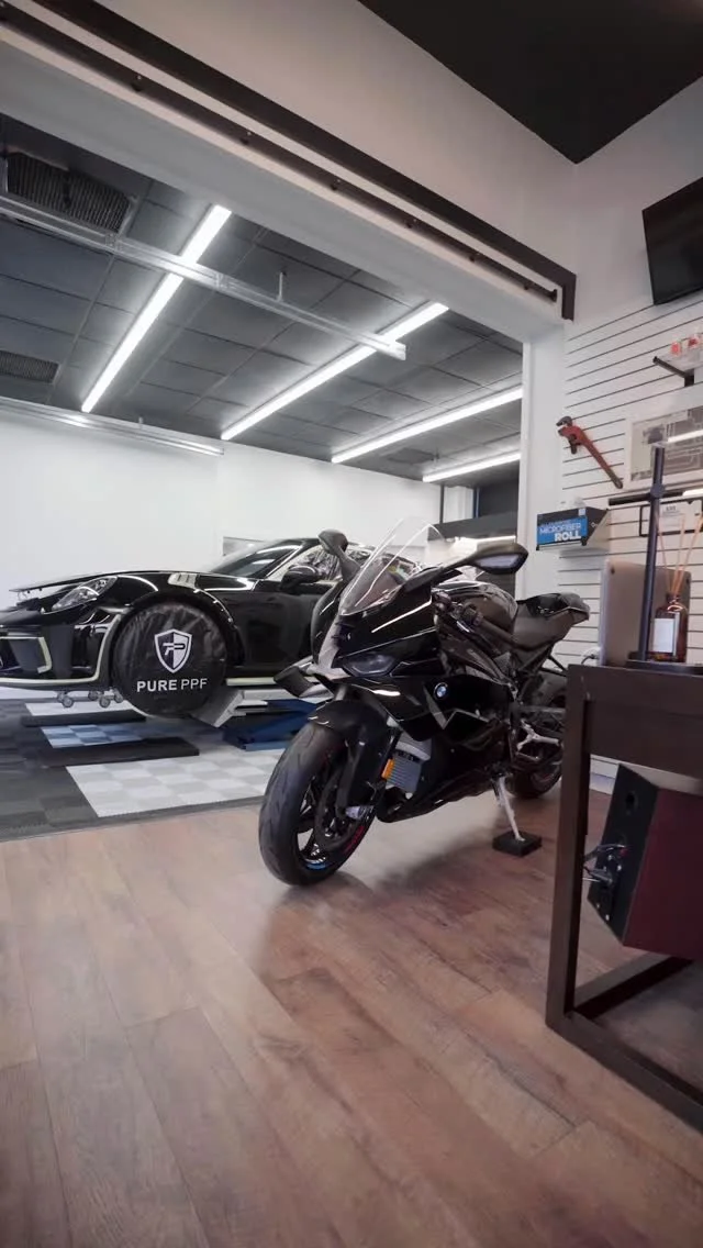 View through a window showing a black Mercedes-Benz G-Class SUV parked inside a garage with a checkered floor.